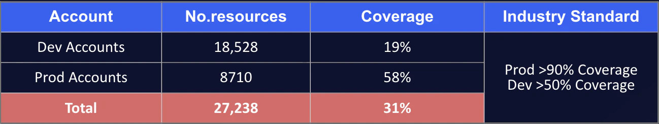 Only 31% of resources are managed by IaC and ready for DR, meaning No backup in place for 2 out of every 3 resources in the event of deletion, risking SLAs