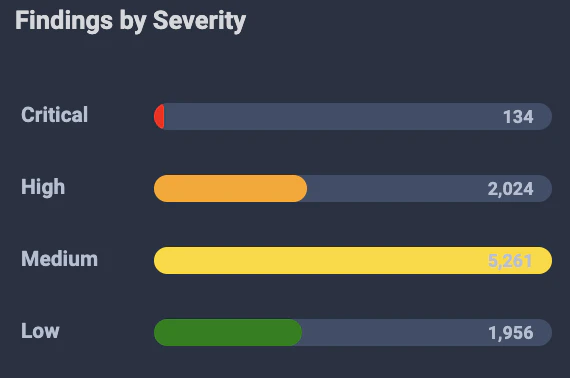 - 1 in 4 of all resources were found to have security misconfigurations including 134 Critical severity and 2.204 high severity vulnerabilities